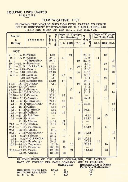 Over the next few years, particularly between 1935 and 1938, the Hellenic Lines fleet was reinforced by six additional steamships, thanks to which the newly formed company was able to make its presence felt, from the outset, in Mediterranean and Northern European liner shipping. At the same time, however, it also experienced a fierce backlash by the coalition of big Northern European companies which now faced the prospect of a new competitor from the Eastern Mediterranean claiming his share of cargo, the transportation of which it had considered its own prerogative for decades.