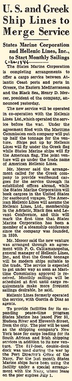 In November 1946, Hellenic Lines launched its new North American-Eastern Mediterranean line, co-founded with the States Marine Corporation. This joint venture continued until 20 November 1947 with the participation of five vessels owned by the American company and five Liberty-type vessels owned by the Greek company, the latter five being part of the 100 that were bought by Greeks between December 1946 and April 1947. After the end of the collaboration, the line continued to be operated exclusively by the five vessels owned by Hellenic Lines. Soon afterwards, its fleet was expanded through the acquisition, in public auction, of the two ships which it was already managing, as well as another vessel it acquired through its British subsidiary, the Fenton Steamship Company Ltd.