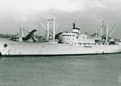 The cargo ship ONDINE, 4,450 dwt, built in March 1960 by Chantiers Navale des Flandres S.A., Bruges, Belgium, for Caribbean Atlantic Cargo Inc. under Greek flag. (Print by A. Duncan).