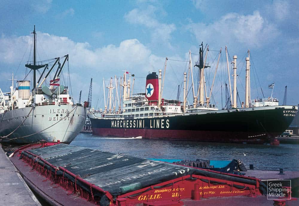 The cargo ship EURYLOCHUS, 13,350 dwt, built in August 1960 by A.G. “Weser” Werk Seebeck, Bremerhaven, West Germany, for Compania Maritima San Basilio S.A. under Greek flag.
