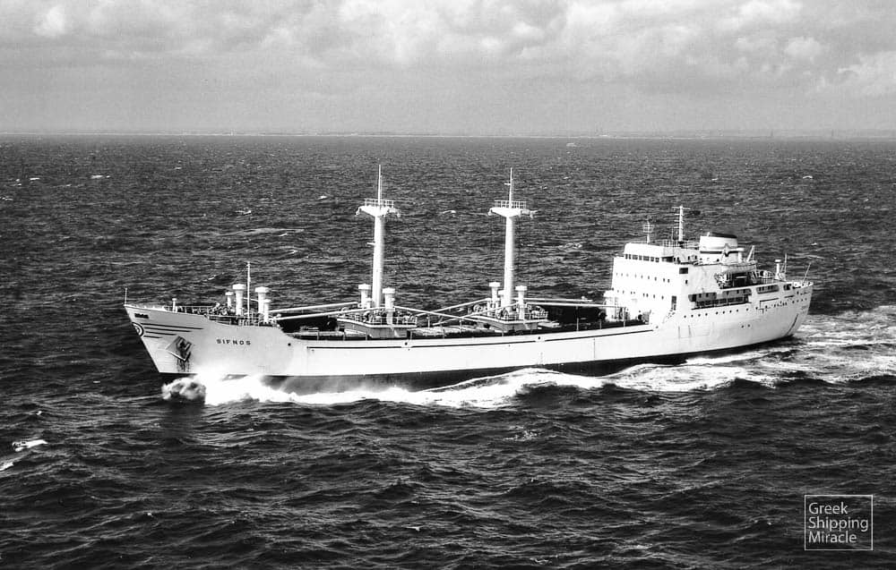 The cargo ship SIFNOS, 5,497 dwt, built in August 1962 by N.V. Scheepswerf “De Hoop”, Lobith, The Netherlands, for Reefer & General Shipping Co. Inc. under Greek flag.