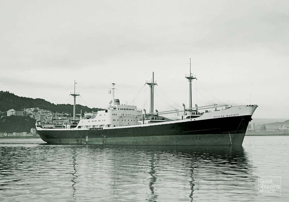 The cargo ship AEGEAN MARINER, 15,518 dwt, built in September 1962 by Ateliers et Chantiers de Dunkerque et Bordeaux (France-Gironde), Bordeaux, France, for Porto Nacional Compania Naviera S.A. under Greek flag.