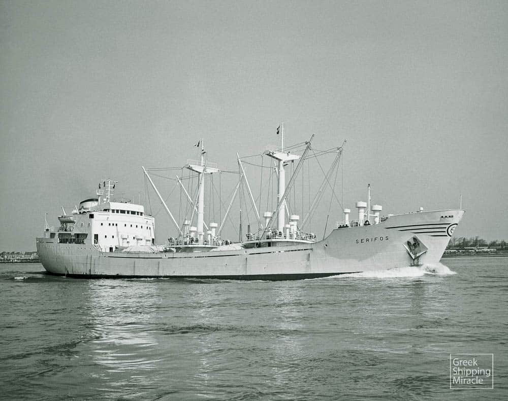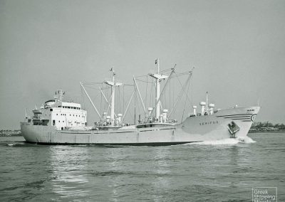 The cargo ship SERIFOS, 5,410 dwt, built in March 1963 by N.V. Scheepswerf “De Hoop”, Lobith, The Netherlands, for Reefer & General Shipping Co. Inc. under Greek flag.