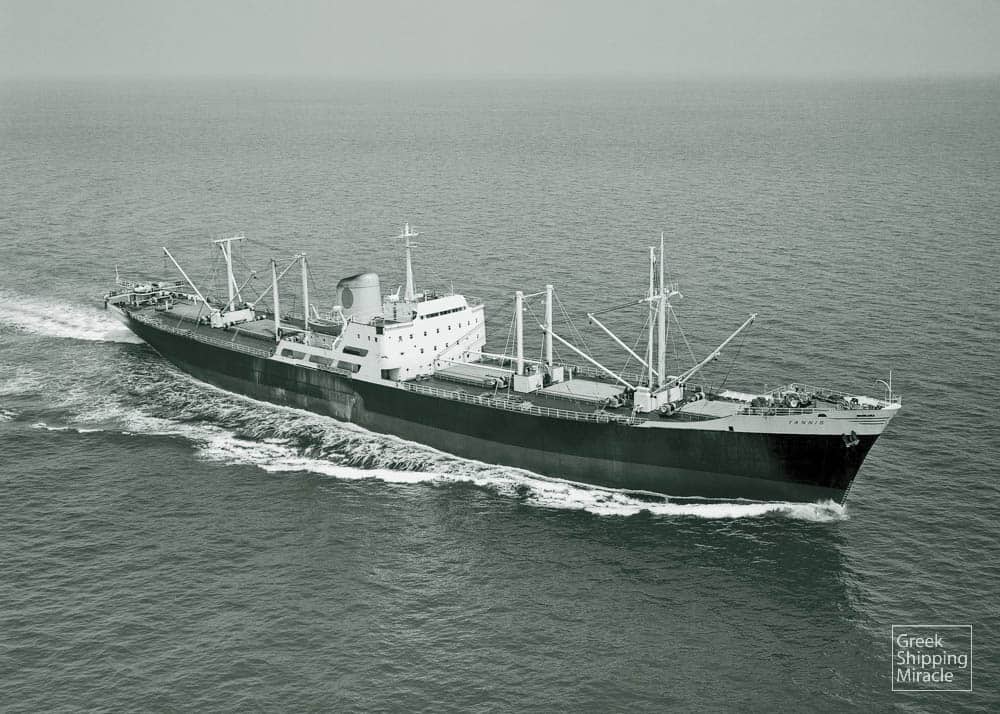 The cargo ship YANNIS, 16,816 dwt, built in June 1963 by William Doxford & Sons Ltd., Sunderland, UK, for Humanitas Compania Naviera S.A. under Greek flag.