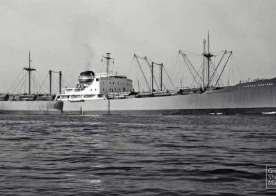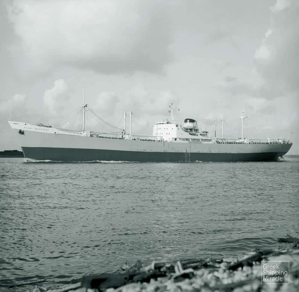 The cargo ship PEARL TRADER, 15,100 dwt, built in February 1962 by William Doxford & Sons Ltd., Sunderland, UK, for Monrovia Shipping Co. Ltd. of Liberia under Greek flag.