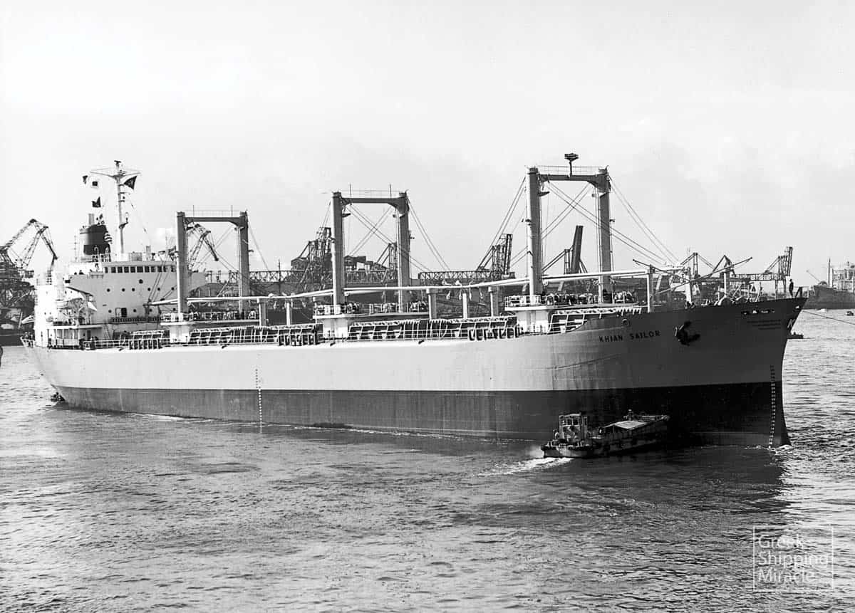 The Freedom-type cargo ship KHIAN SUN, 14,924 dwt, built in March 1969 by Ishikawajima-Harima Heavy Industries Co. Ltd., Tokyo, Japan, for Freedom Pacific Tramping S.A. under Greek flag.