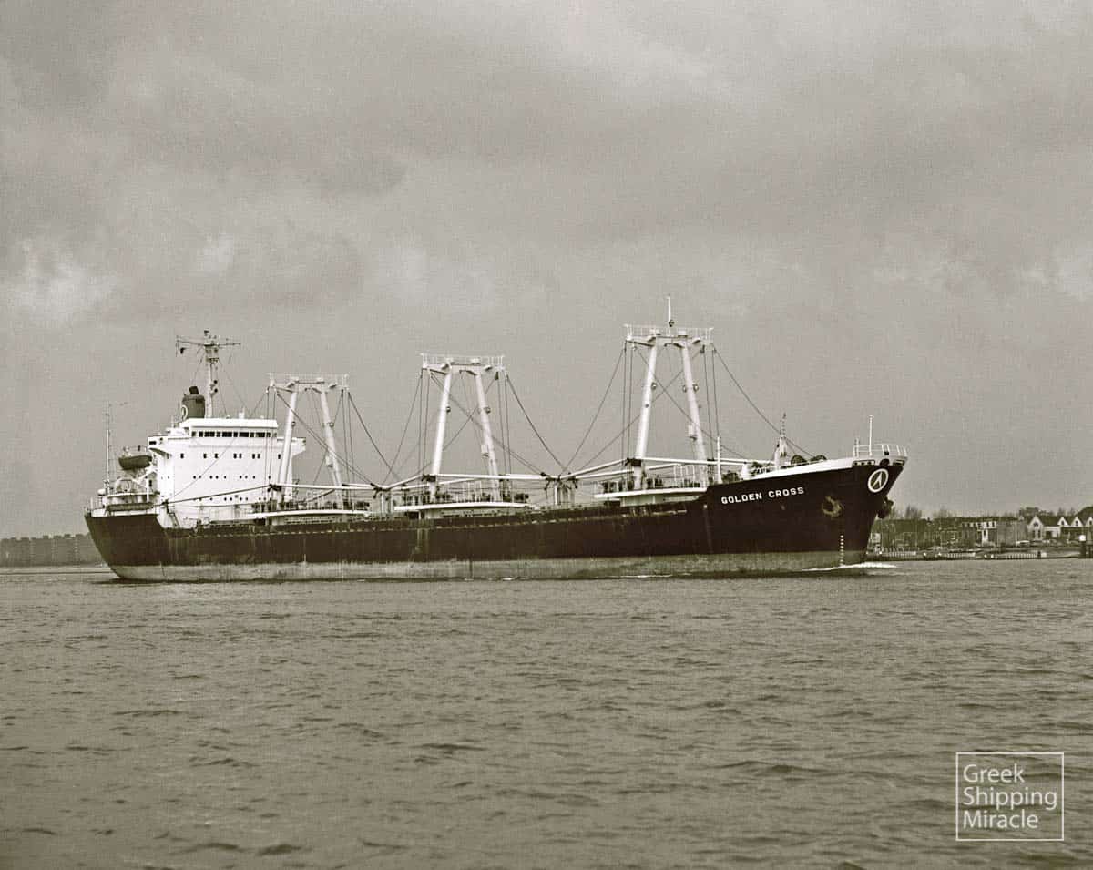 The cargo ship GOLDEN CROSS, 16,493 dwt, built in January 1969 by Nippon Kokan K.K., Shimizu, Japan, for Golden Cross Steamship, Inc. under Greek flag. (V. H. Young & L. A. Sawyer).