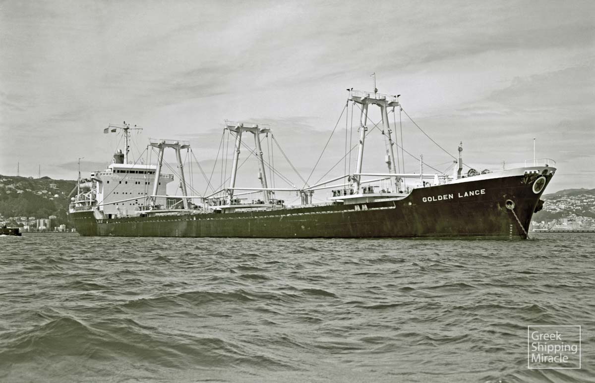 The cargo ship GOLDEN LANCE, 16,493 dwt, built in March 1969 by Nippon Kokan K.K., Shimizu, Japan for Golden Lance Steamship, Inc. under Greek flag.