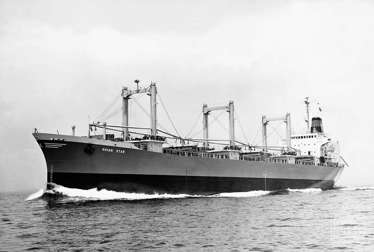 The Freedom-type cargo ship KHIAN STAR, 14,939 dwt, built in June 1969 by Ishikawajima-Harima Heavy Industries Co. Ltd., Tokyo, Japan for Associated Continental Bulk Carriers S.A. under Greek flag.