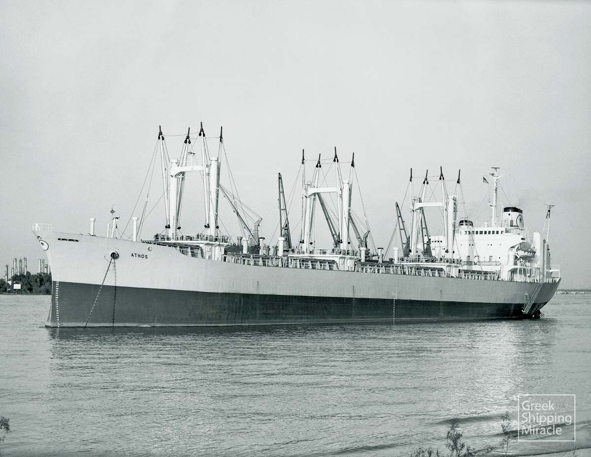 The Freedom-type cargo ship ATHOS, 14,934 dwt, built in July 1969 by Ishikawajima-Harima Heavy Industries Co. Ltd., Nagoya, Japan for Athos Shipping Co. S.A. under Greek flag.