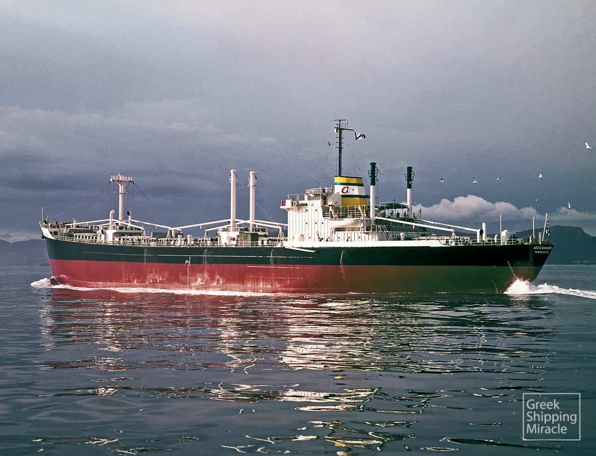 The cargo ship AEGIS PIONEER, 15,005 dwt, built in April 1969 by Bremer Vulcan, Schiffbau & Maschinenfabrik, Bremen-Vegesack, West Germany for Speedwell Shipping Co. Ltd. under Greek flag.