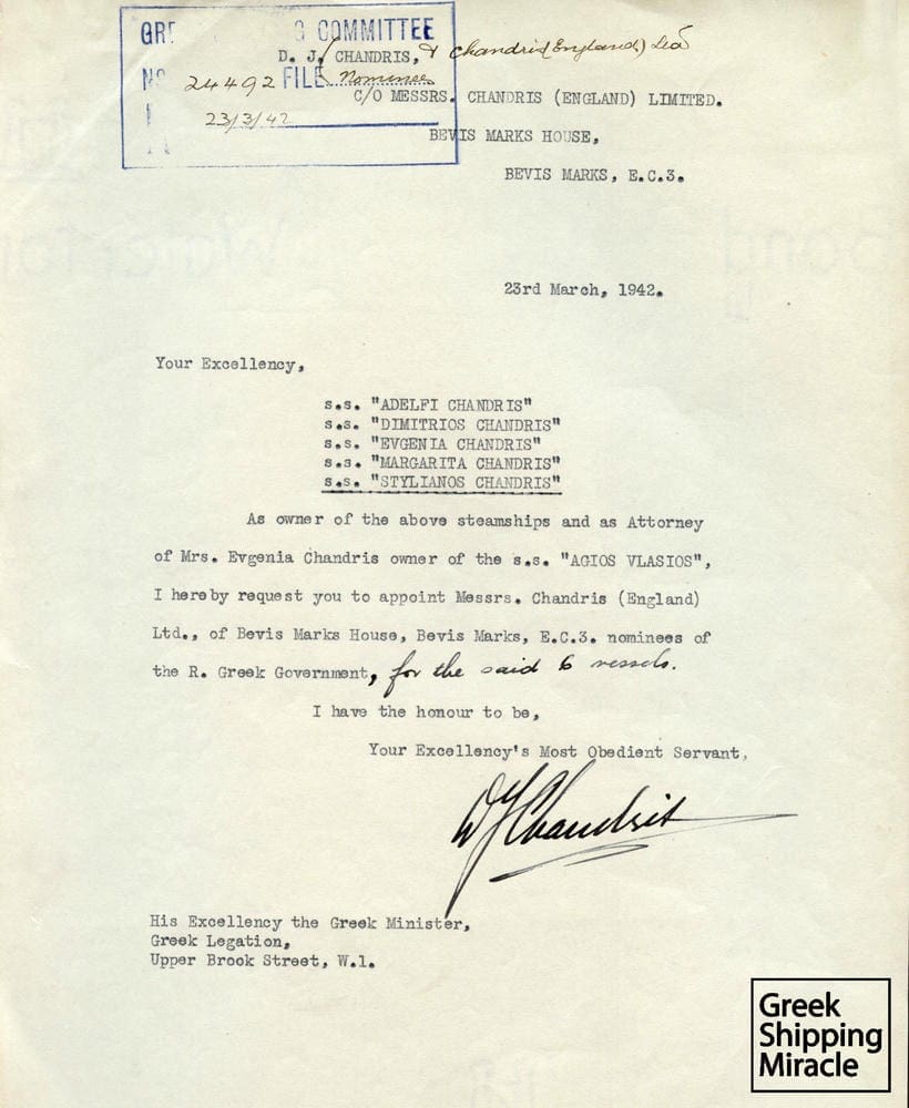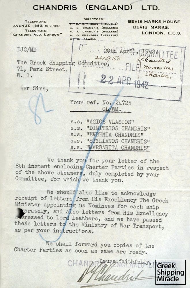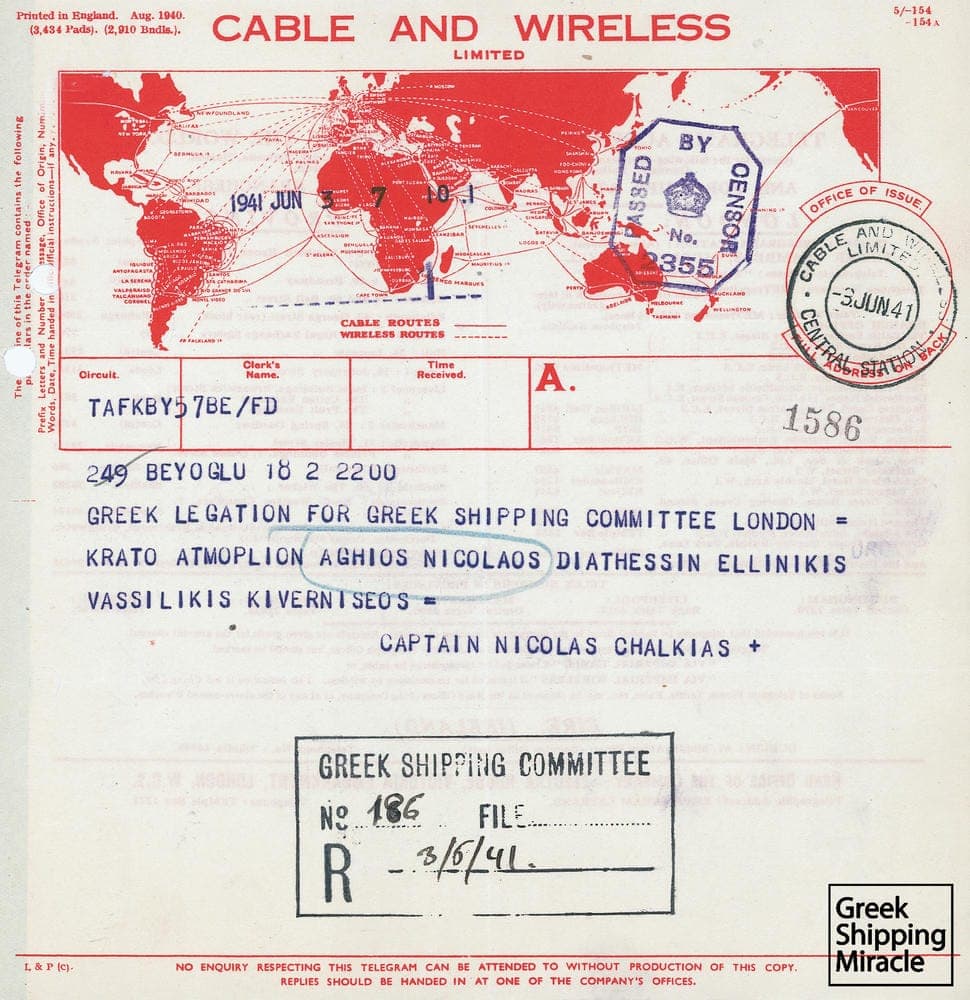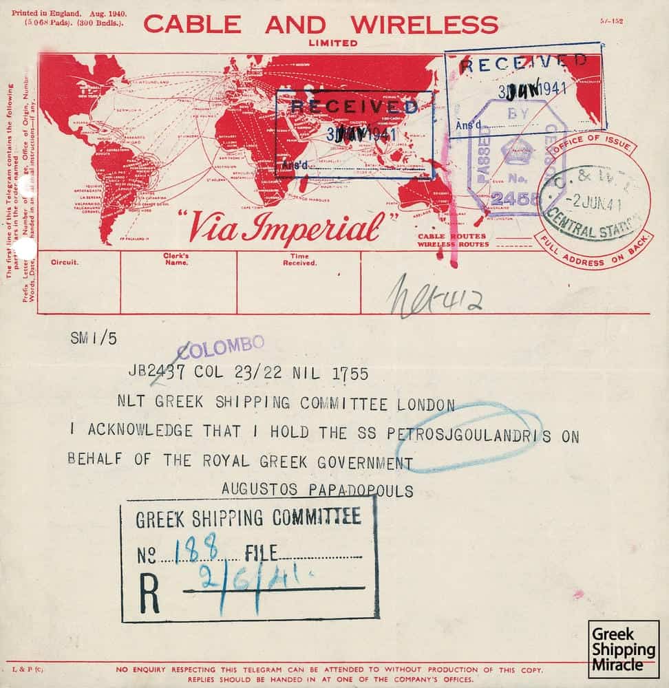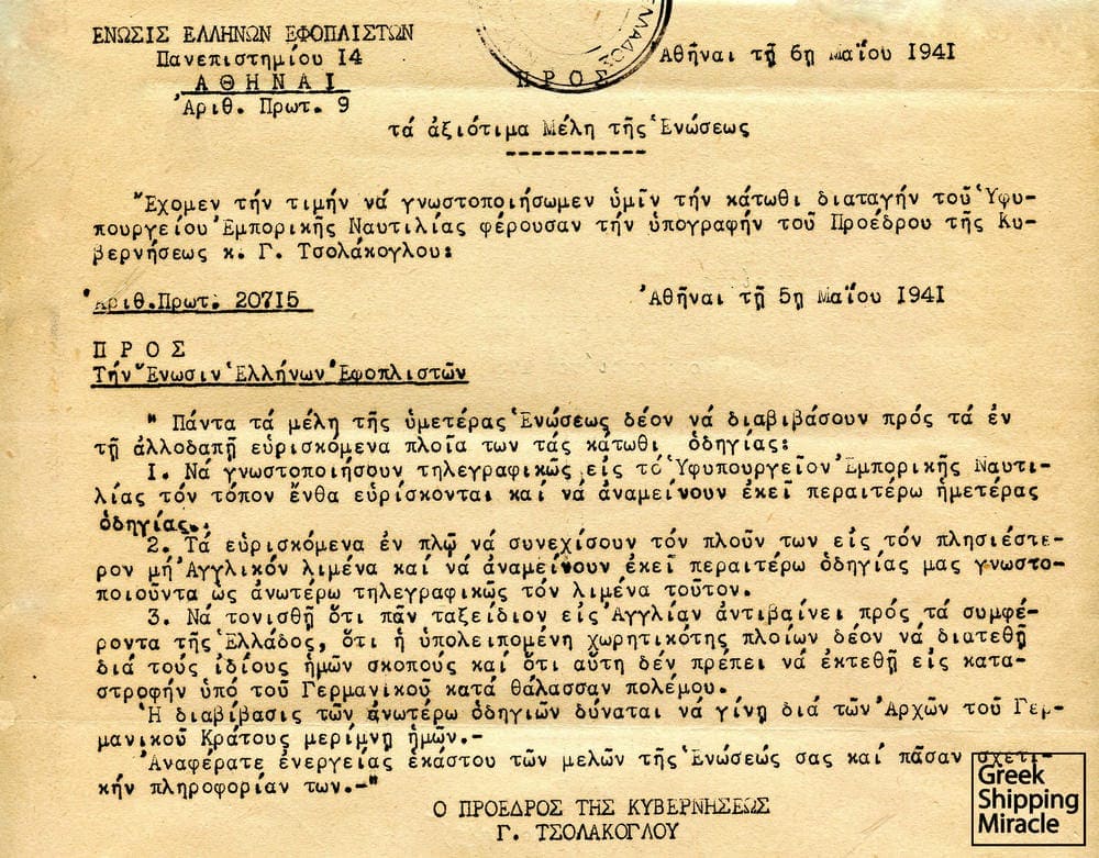 Among Germany’s first priorities following the occupation of Athens was to secure the control of Greek cargo steamers still in service outside the Greek borders. The Prime Minister of the puppet government Georgios Tsolakoglou dispatched a letter to the Union of Greek Shipowners on 5 May 1941, requesting all its members to convey to their ships the orders, according to which all vessels would be placed at the disposal of German forces. However, a few days before the occupation of Athens, the Union of Greek Shipowners’ legal advisor, Georgios Daniolos had taken the initiative to burn all relative files that could link the ownership of ships with individuals in order to prevent the transfer of ownership of the vessels.