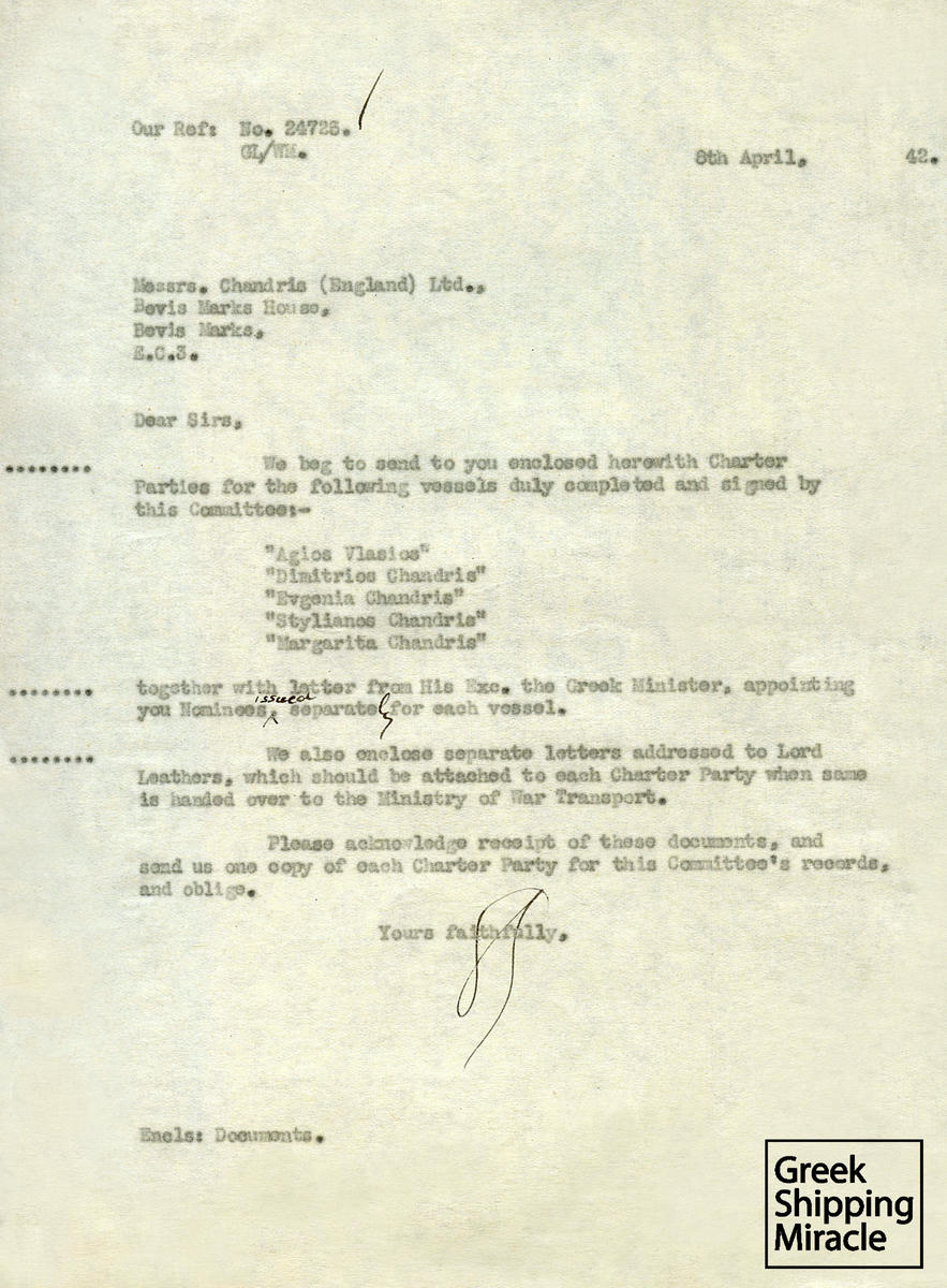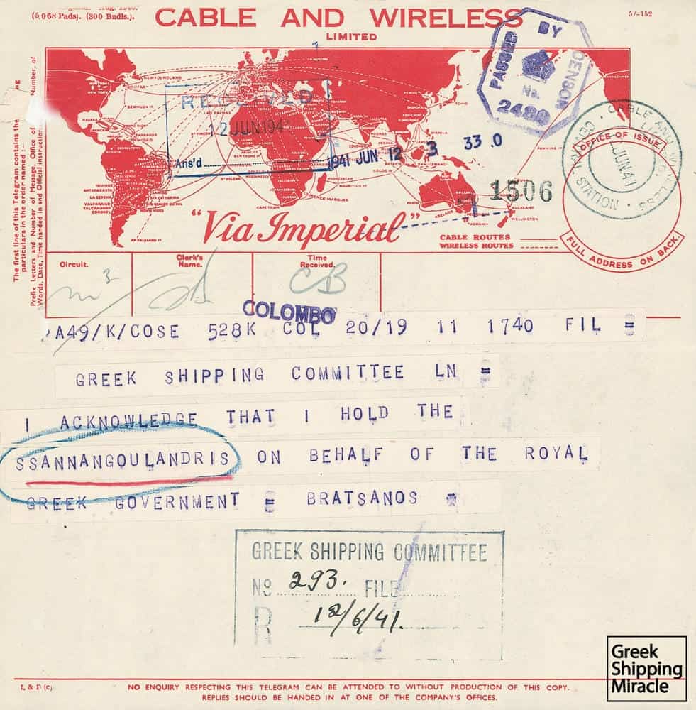 Meanwhile, the remaining Greek ships were requisitioned by order of the official government of Greece, headed by Emmanuel Tsouderos. Formed under tragic circumstances with the support of the British when the German forces were approaching Athens, the government had eventually moved to Crete. Following the requisition order, all ships were placed under the control of the British forces throughout the War plus an additional six-month period after its termination, according to the Anglo-Hellenic Agreement signed by the government. This agreement was made in the absence of shipowners, depriving them of securing more favourable terms. Thus, the Greek merchant fleet, despite offering invaluable services to the Allies by carrying a total of 40 million tons of supplies, and suffering the tragic loss of over 2,000 Greek seafarers as well as the decimation of about 70% of the fleet’s pre-war capacity, was left devastated after the War with its owners lacking the necessary funds for its reconstruction. It must be stated that throughout the War, shipowners acted as managers of their own ships, appointed by the Greek Maritime Commission that was set up in London under the control of the Greek ambassador. Their income was restricted to a monthly hire, equal for all ships and basically covering operating costs, which were unfortunately constantly rising. This was due to excessive demands by seafarers, whose requests were readily met by the Greek government, residing at that time in Cairo.