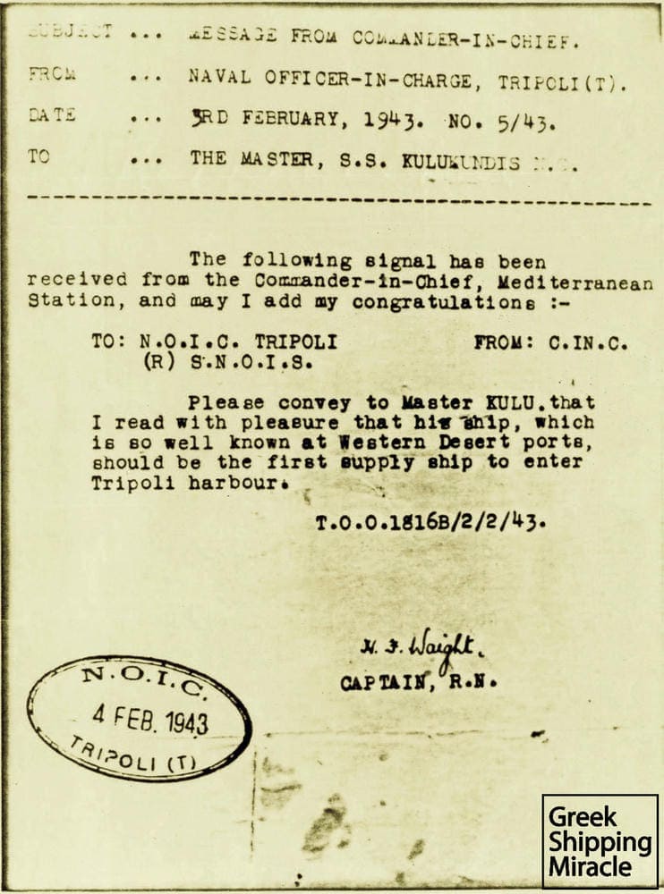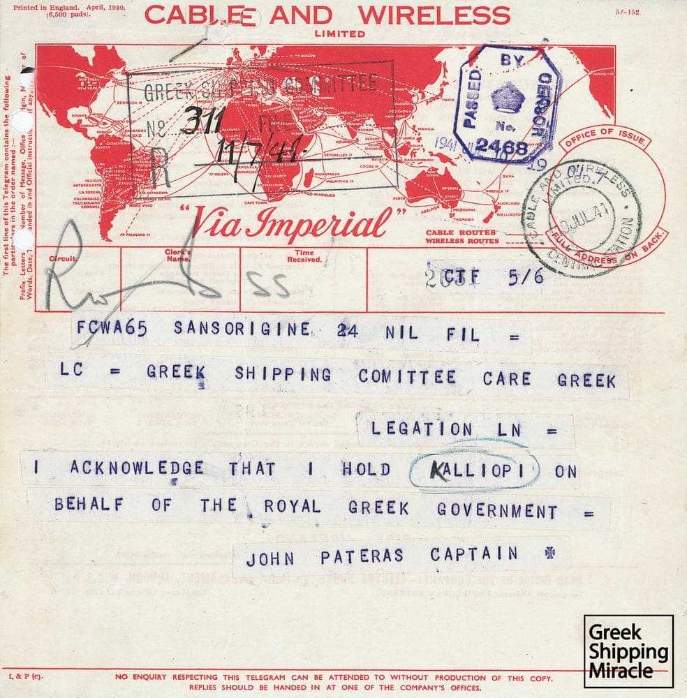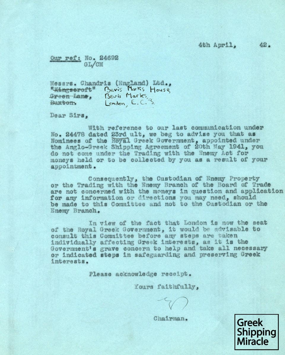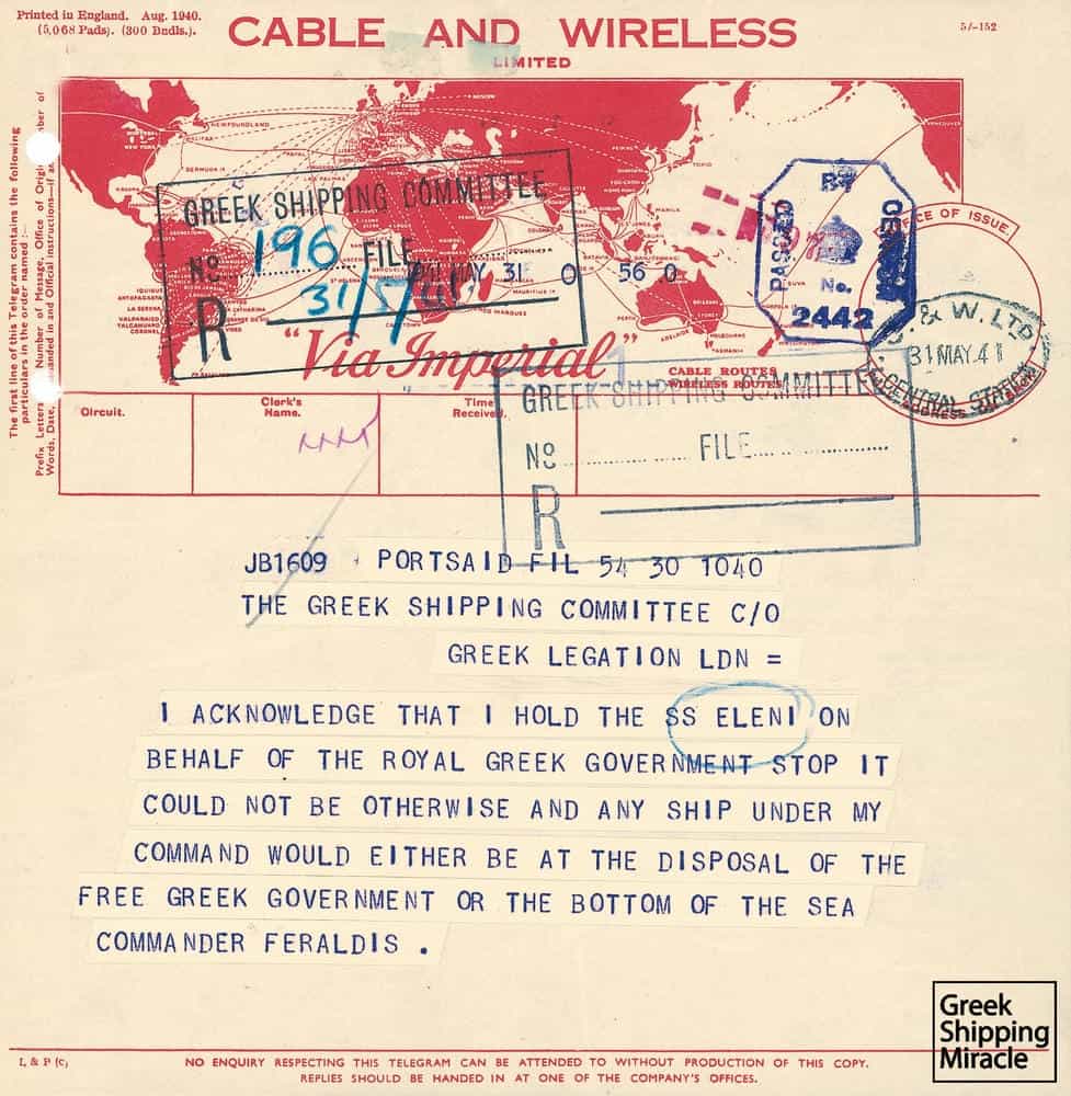 Thus, the only significant financial compensation from the enormous sacrifice of the Greek fleet was some 12,000,000 pounds transferred to the Greek government in Cairo, constituting surplus money from the chartering of the Greek fleet. These funds were used to cover the costs of the government’s operation during the War and were thus never returned to the Greek shipowners.