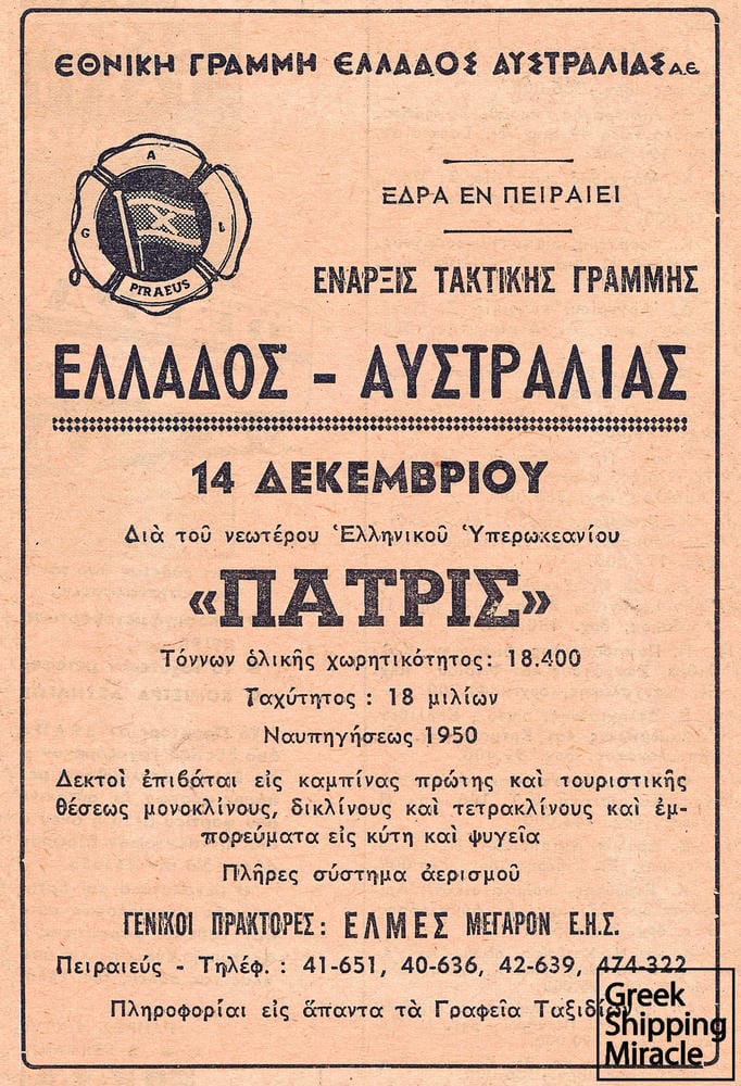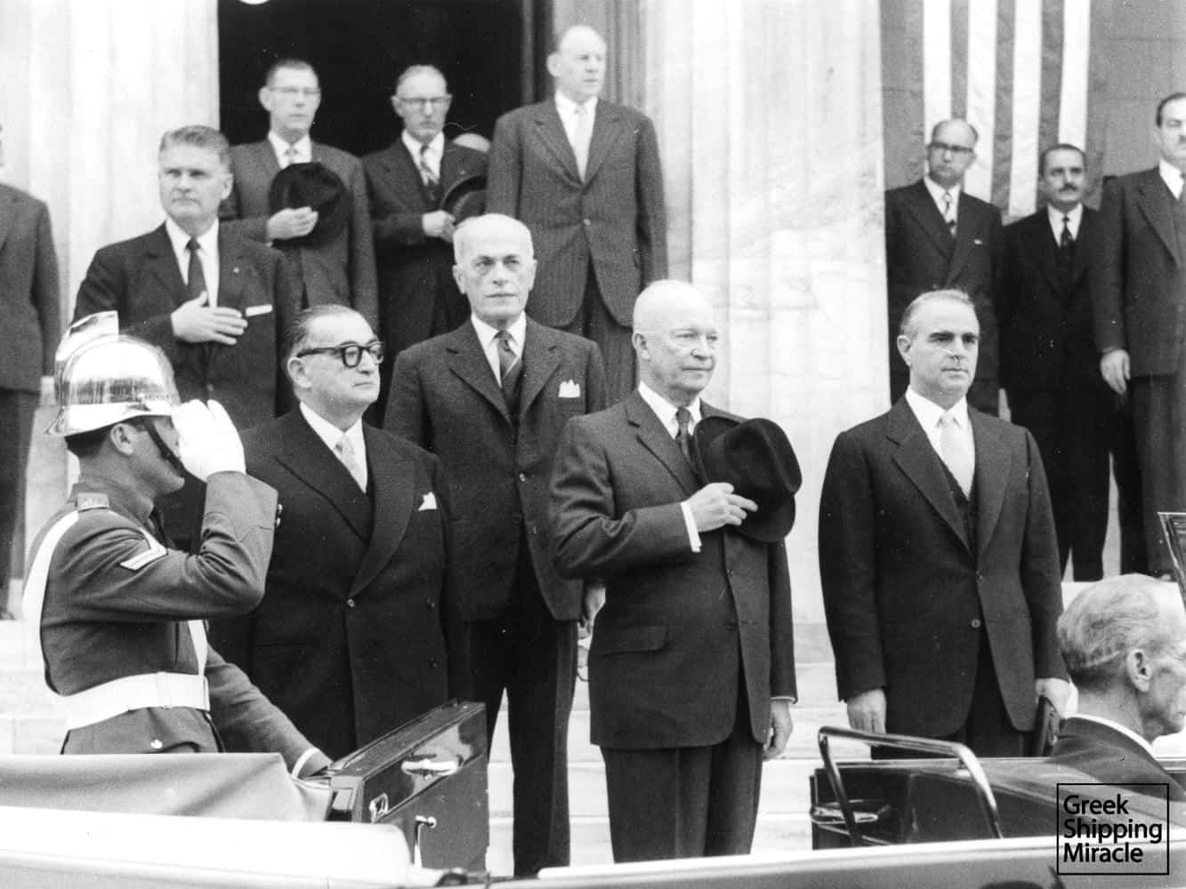Karamanlis was one of the very few politicians who never hesitated to state that his main interest was the prestige that a country of Greece’s size would enjoy having a powerful merchant fleet. A typical example of his personal interest was demonstrated during the inauguration of the transoceanic PATRIS on 13 December 1959, which initiated the Greece-Australia Line. On that day, the Greek administration was preoccupied with arrangements for the arrival of Dwight Eisenhower the following day, being the first official visit of a US president in Greece. Nevertheless, Karamanlis went to Piraeus to inaugurate the PATRIS and spent some time on board shown around by its owner, Anthony Chandris.
