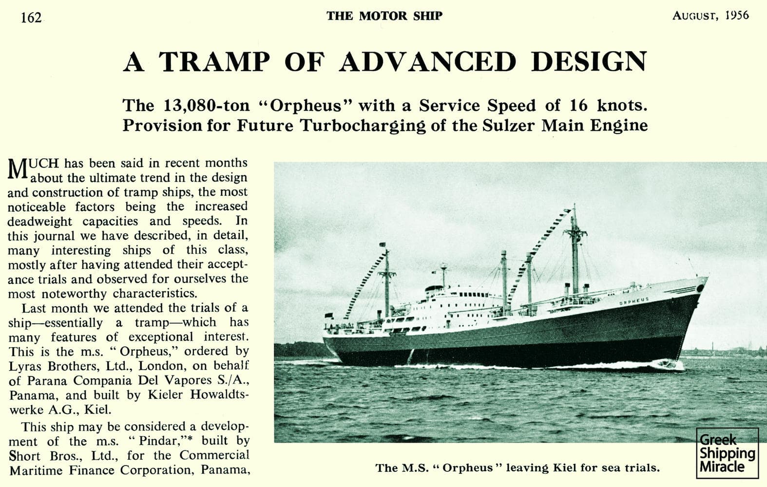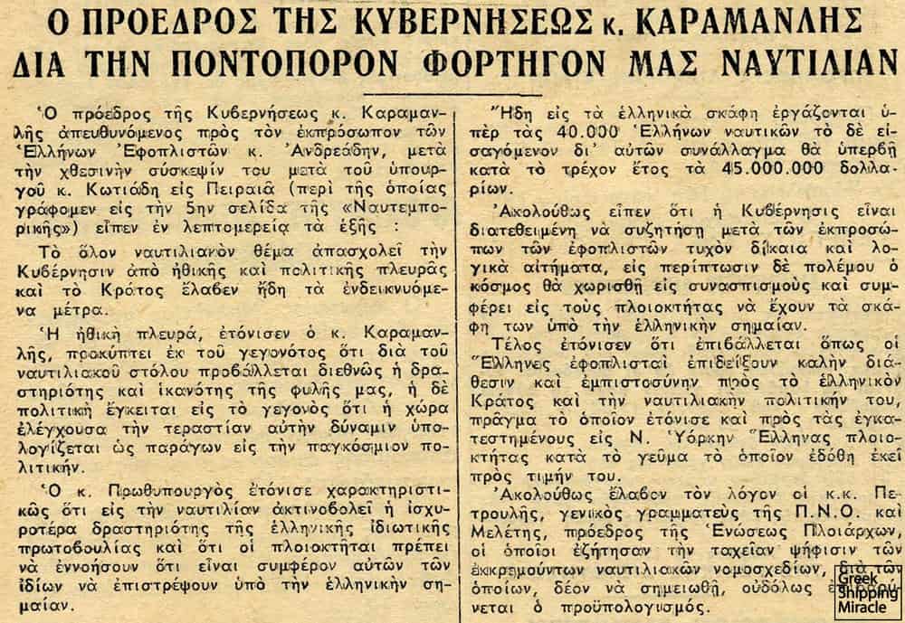 On 4 October 1955, Alexander Papagos passed away and Constantine Karamanlis was sworn in as Prime Minister. World shipping was at the time in a state of euphoria, due to the improved freight market. In early 1956, despite the fact that the majority of Greek-owned newbuildings were still delivered under foreign flags, the efforts to revive the Greek registry were clearly leading to positive results. In the meantime, the climate between shipowners and the state had drastically improved and this was highlighted through important investments in the country by renowned shipowners. Among these was the establishment of a shipbuilding facility at Skaramanga, near Athens, by Stavros Niarchos, as well as the signing of a memorandum of agreement with Aristotle Onassis that led to the creation of Olympic Airways. In the same year, improving relations between shipowners and seafarers led to the adoption of appropriate measures allowing Greeks serving on board foreign flagged ships to be insured through the Seamen’s Pension Fund (NAT).