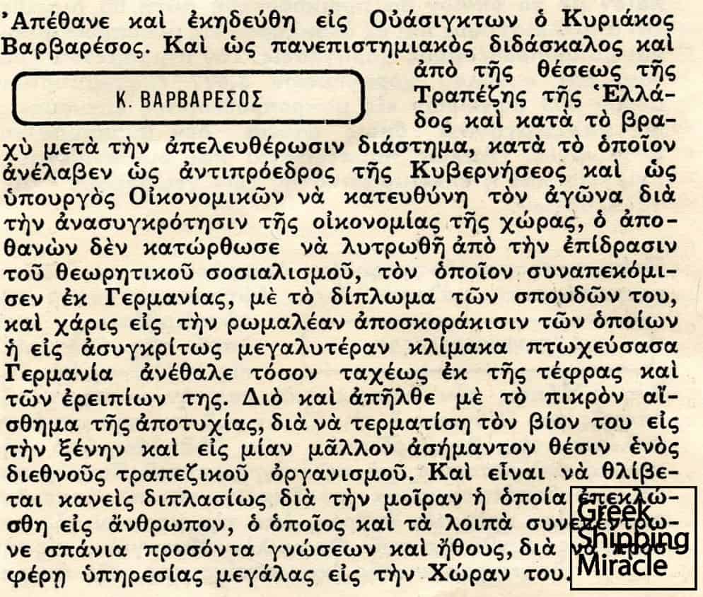 The Papagos administration, incorporating a distinguished team of economists, headed by the Minister for Coordination Spyros Markezinis, fully appreciated the enormous boost in the economy should the majority of the Greek-owned ships acquired after the War be placed under the Greek flag. Such a prospect could also benefit the country in a different way. Many entrepreneurial initiatives by Greek shipowners contributed significantly to the economies of foreign countries and thus a strong Greek registry could ultimately become an invaluable tool for Greek foreign policy.