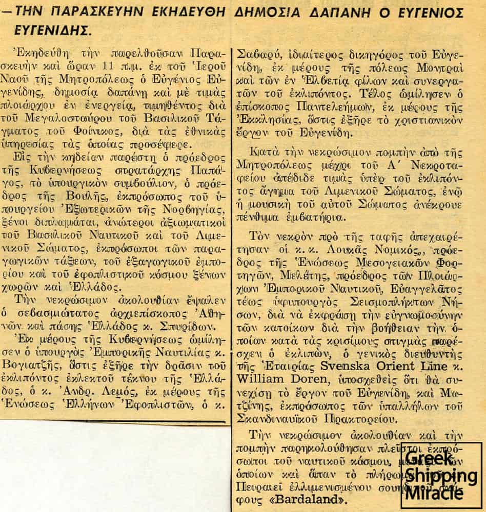 The measures adopted to facilitate the revival of the Greek registry did not, however, have an immediate effect. It was first necessary to consolidate mutual trust between the state and investors, which took time following a long period of turmoil. Shipowner Markos Nomikos tried to set an example by placing a newly built tanker under the Greek flag, before the government introduced measures to strengthen the registry, while fellow shipowner Eugene Eugenides raised the Greek flag on a new dry cargo vessel a few months later. The latter also promised Prime Minister Papagos to place an ocean liner under the Greek flag in the line between Greece and the USA, whose importance was growing following the post-war increase of Greek immigration. Unfortunately, Eugenides passed away suddenly in April 1954; however, his heirs, respecting his will, raised the Greek flag on the liner QUEEN FREDERICA, which started its transatlantic voyages a few months later, acting as a bridge connecting Greek immigrants to their homeland. The ultimate offer of this great benefactor to his country was the establishment of the Eugenides Foundation.