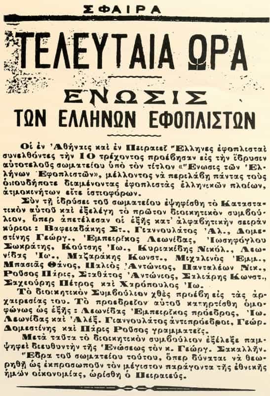 On 16 February 1916, the Union of Greek Shipowners was founded. It was headquartered in Piraeus and Leonidas A. Empiricos was elected its first president.
