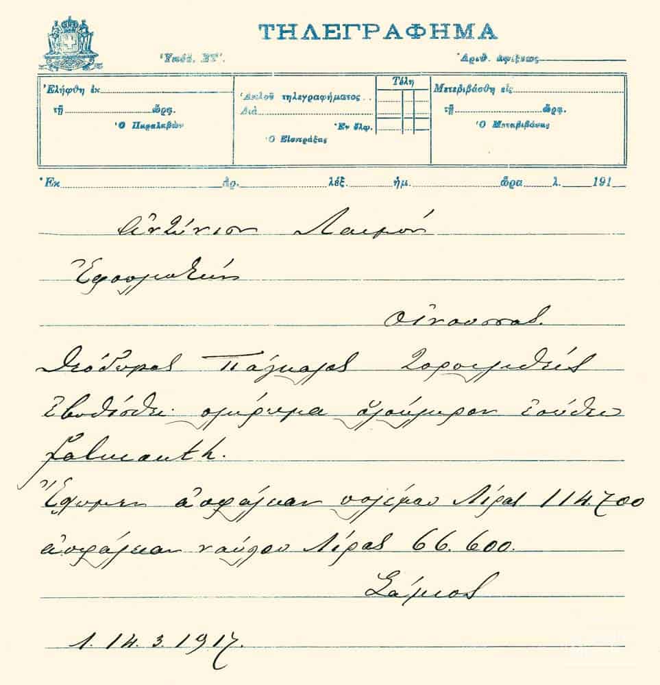 Συντετριμμένος ο οινούσσιος καραβοκύρης επέστρεψε στο νησί του. Oι κόποι δεκαετιών είχαν χαθεί και ο ίδιος με την πολυμελή οικογένειά του αντιμετώπιζαν πλέον οξύ πρόβλημα οικονομικής επιβίωσης. Oι σκέψεις του τον οδήγησαν στην απόφαση να ακολουθήσει το δρόμο της μετανάστευσης στις Hνωμένες Πολιτείες παίρνοντας μαζί και τους δύο μεγαλύτερους γιούς του. Μόλις όμως ανακοίνωσε με δυσκολία την απόφασή του στην αγαπημένη του γυναίκα Kατίγκω, εκείνη την απέρριψε κατηγορηματικά. Η δυναμική γυναίκα –η οποία στις Οινούσσες ήταν γνωστή ως η Κυρακατίγκω– δήλωσε ότι είχε τρόπο να τον βοηθήσει αποκαλύπτοντας κεραμικά δοχεία με χρυσά νομίσματα, τα οποία είχε καλά φυλαγμένα κάτω από τα μαδέρια του πατώματος του σπιτιού τους. Ως προνοητική και υπεύθυνη γυναίκα, τα είχε εξοικονομήσει από τα χρήματα που της έστελνε ο άντρας της στη διάρκεια της πολυετούς σταδιοδρομίας του στη θάλασσα.