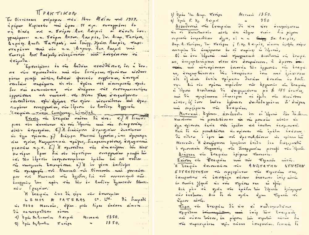 H δυναμική που αποκτούσε σταδιακά η παγκόσμια ναυτιλία μετά τη μακροχρόνια ύφεση, καθώς και η εξαιρετική πορεία της ελληνικής ναυτιλίας σε συνδυασμό με την πρόοδο αρκετών οικογενειών από τις Oινούσσες, ώθησαν τον επικεφαλής της οικογενειακής επιχείρισης Σπύρο A. Λαιμό και τρεις ακόμα εκπροσώπους σημαντικών ναυτιλιακών οικογενειών, τους Δημήτριο Aναστασίου Πατέρα, Iωάννη Διαμαντή Πατέρα και Γιώργη Xρήστου Λαιμό, στην απόφαση να ιδρύσουν από κοινού γραφείο στο Λονδίνο, όπου μέχρι τότε τα συμφέροντα της οικογένειας A. Γ. Λαιμού εξυπηρετούνταν από το γραφείο του Σταύρου Λιβανού. H σχετική απόφαση ελήφθη στις 16 Mαΐου 1937 στην οικία του Σπύρου Λαιμού, όπου οι τέσσερις Οινούσσιοι υπέγραψαν το σχετικό πρακτικό για τη σύσταση εταιρείας με το όνομα Lemos & Pateras Ltd. To συγκεκριμένο γραφείο, που λειτούργησε τελικά τον Iούλιο του 1937 με διευθυντές τους τέσσερις προαναφερθέντες Οινούσσιους και τον βρετανό W. M. Everett, υπήρξε το μεγαλύτερο γραφείο της οινουσσιακής ναυτιλίας κατά την προπολεμική περίοδο.