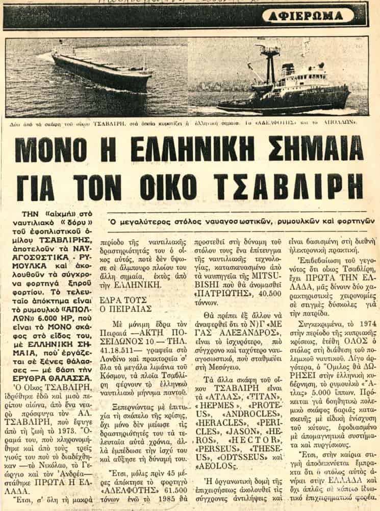 Το 1984, ο όμιλος Τσαβλίρη απέκτησε ένα bulk carrier 61.000 dwt ηλικίας 11 ετών το οποίο μετονομάστηκε ADELFOTIS υψώνοντας ελληνική σημαία. Λίγους μήνες αργότερα οι αδελφοί Τσαβλίρη παρήγγειλαν στα ιαπωνικά ναυπηγεία Mitsubishi Heavy Industries Ltd. στο Nagasaki ένα bulk carrier 42.300 dwt, το οποίο παραδόθηκε τον Φεβρουάριο του 1985 ως το υπό ελληνική σημαία PATRIOTIS.