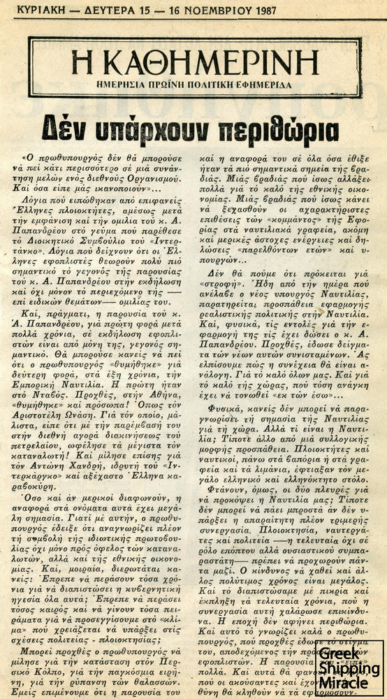 Η πρόβλεψη της εκλογικής νίκης του ΠΑΣΟΚ επιβεβαιώθηκε τον Οκτώβριο του 1981 με τη σαρωτική του επικράτηση. Την ίδια στιγμή, η παγκόσμια ναυτιλία είχε αρχίσει να βιώνει τη μεγαλύτερη κρίση μετά τον Β’ Παγκόσμιο Πόλεμο.