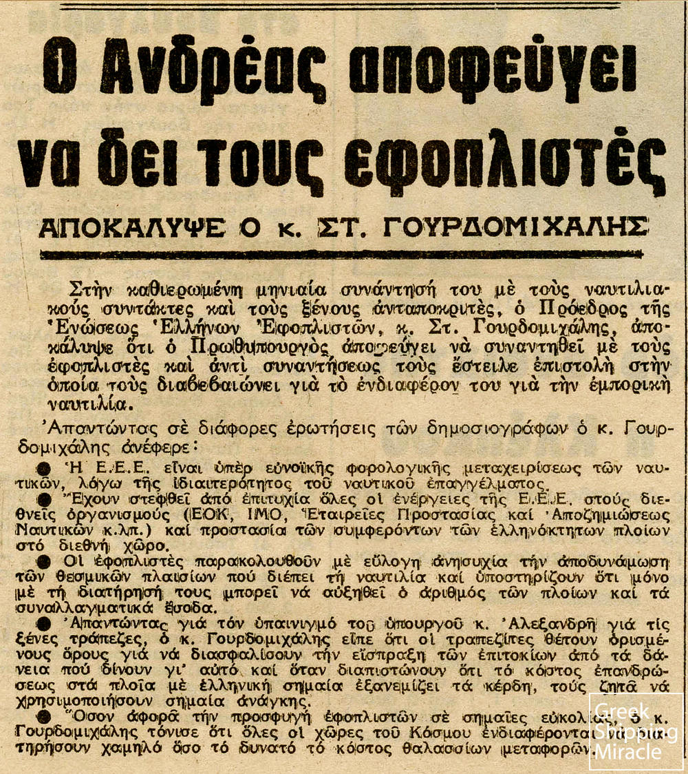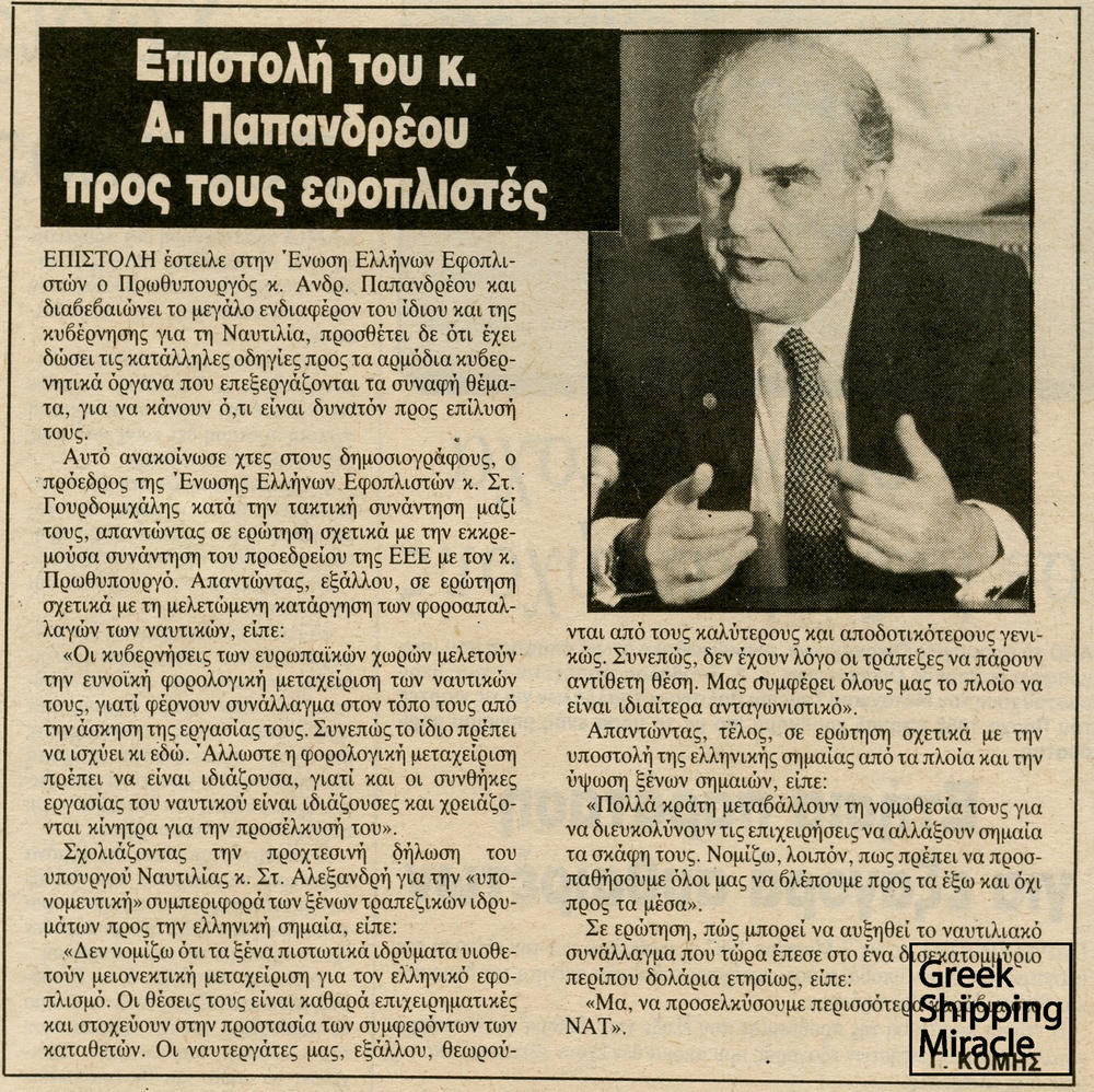 Με την ευκαιρία της εκλογής του νέου προέδρου του διοικητικού συμβουλίου της Ένωσης Ελλήνων Εφοπλιστών, Στάθη Γουρδομιχάλη, στα τέλη του 1984, οι εφοπλιστές ζήτησαν επίσημη συνάντηση με τον πρωθυπουργό. Ο Ανδρέας Παπανδρέου, ο οποίος είχε τελευταία φορά συναντηθεί με εκπροσώπους του εφοπλισμού τον Ιανουάριο του 1983, δεν ανταποκρίθηκε, ακολουθώντας την ίδια στάση μέχρι τη λήξη της πρωθυπουργίας του το 1989.