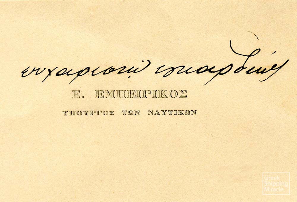 Η πρώτη δεκαετία του αιώνα χαρακτηρίστηκε επίσης από την παρουσία μιας σημαντικής προσωπικότητας της ναυτιλίας, του εφοπλιστή Επαμεινώνδα Κ. Εμπειρίκου. Ο Εμπειρίκος υπηρέτησε επίσης ως πολιτικός, βουλευτής και υπουργός Ναυτικών από το 1908 έως το 1909. Πρωτοστάτησε στη θέσπιση νόμου για τη ναυτική υποθήκη, ο οποίος συντάχθηκε κατά τη διάρκεια της θητείας του ως υπουργός και ψηφίστηκε το 1910. Επιπλέον, ανέλαβε πρωτοβουλίες για τη συμμετοχή της Ελλάδας στην περίφημη Ναυτική Έκθεση του Bordeaux, το 1907, η οποία είχε ως στόχο να παρουσιάσει τα επιτεύγματα των ναυτικών κρατών από την εποχή της επικράτησης του ατμού. Τέλος, ο Επαμεινώνδας Εμπειρίκος ήταν συνιδρυτής της Τράπεζας Αθηνών το 1893, η οποία χρηματοδότησε την αγορά πολλών ελληνικών ατμοπλοίων, ακόμα και πριν τη θέσπιση του νόμου περί ναυτικής υποθήκης.