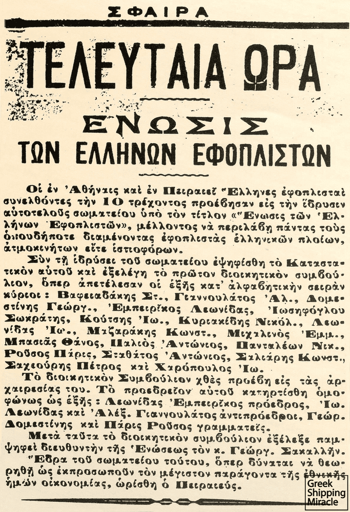 Την ίδια στιγμή ορισμένοι πλοιοκτήτες –με επικεφαλής τον Υδραίο Γκίκα Κουλούρα– προέβαλαν την ανάγκη σύστασης σωματείου για την αποτελεσματικότερη προάσπιση των συμφερόντων του ναυτιλιακού κλάδου. Αυτό όμως δεν ήταν εύκολο εγχείρημα, καθώς τα λίγα ναυτιλιακά γραφεία που μέχρι εκείνη την εποχή είχαν ιδρυθεί από Έλληνες, ήταν διασκορπισμένα, κυρίως στο Ηνωμένο Βασίλειο, συγκεκριμένα στο Λονδίνο, το Κάρντιφ και το Νιούκαστλ. Επίσης, οι περισσότεροι εφοπλιστές ήταν συγχρόνως και πλοίαρχοι των ατμοπλοίων τους. Κατά συνέπεια, τίποτα δεν άλλαξε μέχρι το ξέσπασμα του Α’ Παγκοσμίου Πολέμου, τον Σεπτέμβριο του 1914, με εξαίρεση την προσθήκη περίπου 100 ατμόπλοιων στο ελληνικό νηολόγιο.