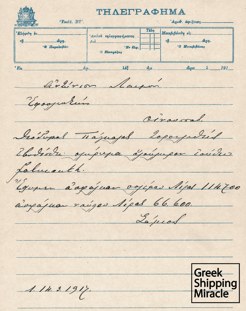 Με την είσοδο της Ελλάδας στον Α’ Παγκόσμιο Πόλεμο το 1917, το επίκεντρο της ναυτιλιακής δραστηριότητας των Ελλήνων μεταφέρθηκε στο Ηνωμένο Βασίλειο, όπου λειτουργούσε ένας σημαντικός αριθμός ελληνικών ναυτιλιακών γραφείων. Το σύνολο των ατμοπλοίων υπό ελληνική σημαία ναυλώθηκαν στη συμμαχική βρετανική κυβέρνηση με σαφώς χαμηλότερους ναύλους από αυτούς που επικρατούσαν στην ελεύθερη αγορά. Συγχρόνως, τέθηκαν περιορισμοί στο ύψος των ασφαλιστικών αποζημιώσεων που θα καταβάλλονταν σε περίπτωση απώλειας πλοίου λόγω εχθροπραξίας. Μέσα σε σύντομο χρονικό διάστημα, η ελληνική ναυτιλία, τα πλοία της οποίας αξιοποιήθηκαν από τις συμμαχικές δυνάμεις στις πλέον επικίνδυνες μεταφορές (γαιανθράκων από το Ηνωμένο Βασίλειο στη Μεσόγειο και μεταλλευμάτων από τη Μεσόγειο στο Ηνωμένο Βασίλειο) υπέστη τον αποδεκατισμό κυρίως από πυρά γερμανικών υποβρυχίων. Με τη λήξη του πολέμου, ο εμπορικός στόλος των Ελλήνων, έχοντας καταγράψει τις μεγαλύτερες απώλειες συγκριτικά με τις ναυτιλίες των άλλων κρατών της Αντάντ, είχε συρρικνωθεί δραματικά σε σχέση με τον ισχυρό στόλο του 1915.