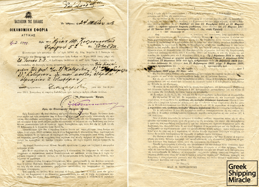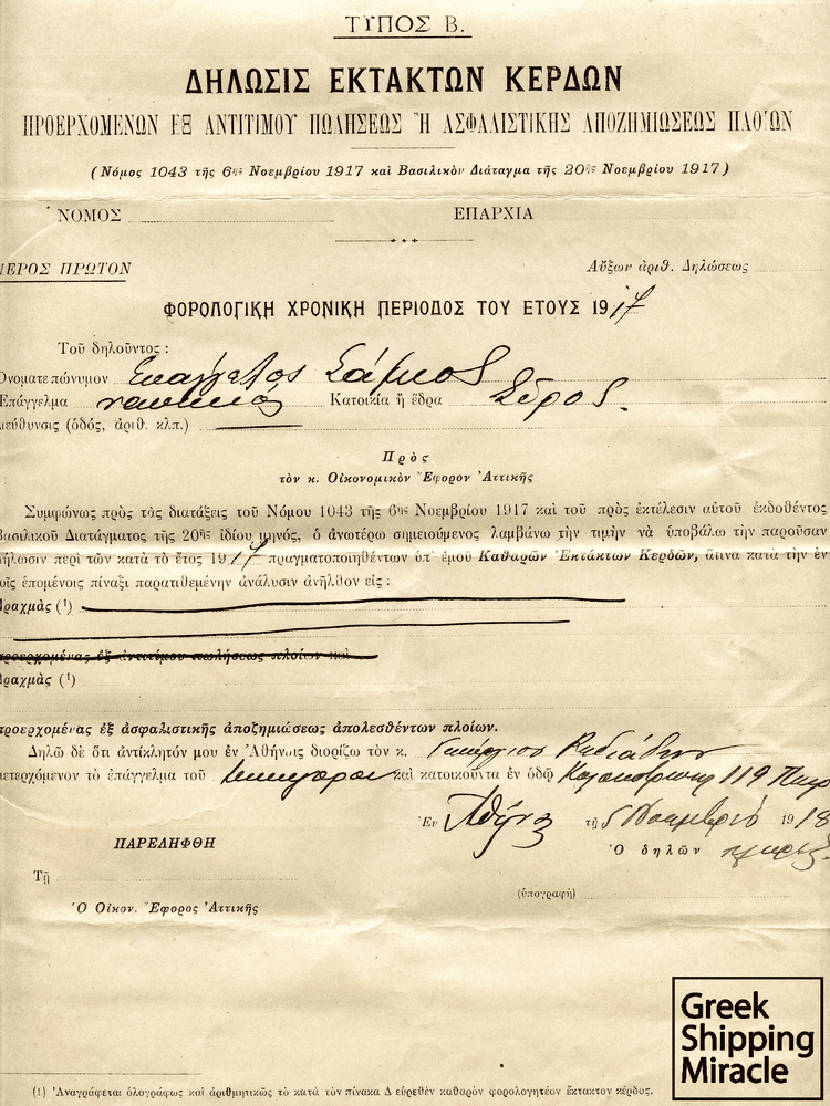 Στη συνέχεια, όμως, τον Νοέμβριο του 1917, η ελληνική κυβέρνηση επέβαλε έκτακτη βαριά φορολογία με αναδρομική ισχύ επί όλων των κερδών από τη διαχείριση πλοίων από το 1915, καθώς και επί της υπεραξίας που είχε δημιουργηθεί είτε από την πώληση είτε από την ασφαλιστική αποζημίωση των απολεσθέντων σκαφών. Ο πρωθυπουργός Ελευθέριος Βενιζέλος, στην προσπάθεια του να ανακτήσει το συντομότερο δυνατό η χώρα έναν αξιόλογο εμπορικό στόλο, ο οποίος θα μπορούσε να συμβάλλει καθοριστικά στην περίπτωση μιας νέας σύρραξης, συμπεριέλαβε στο νόμο ένα ειδικό διάταγμα. Προβλεπόταν, επομένως, η απαλλαγή του παραπάνω φόρου στους πλοιοκτήτες που εντός πενταετίας από τη λήξη του Α’ Παγκοσμίου Πολέμου θα προέβαιναν στην αγορά ή στη ναυπήγηση πλοίων προς αντικατάσταση αυτών που είχαν πουληθεί ή αποζημιωθεί. Το διάταγμα αυτό, του οποίου η προθεσμία μειώθηκε από πέντε χρόνια σε δύο το 1919, οδήγησε πολλούς πλοιοκτήτες στη βεβιασμένη απόφαση να επενδύσουν το μεγαλύτερο μέρος των κερδών τους για την απόκτηση πλοίων σε εντελώς λανθασμένο χρόνο. Αυτό αποδείχθηκε καταστροφικό για τους περισσότερους, καθώς, επίσης, οδήγησε στην ποιοτική υποβάθμιση της ναυτιλίας τα επόμενα χρόνια.