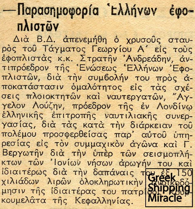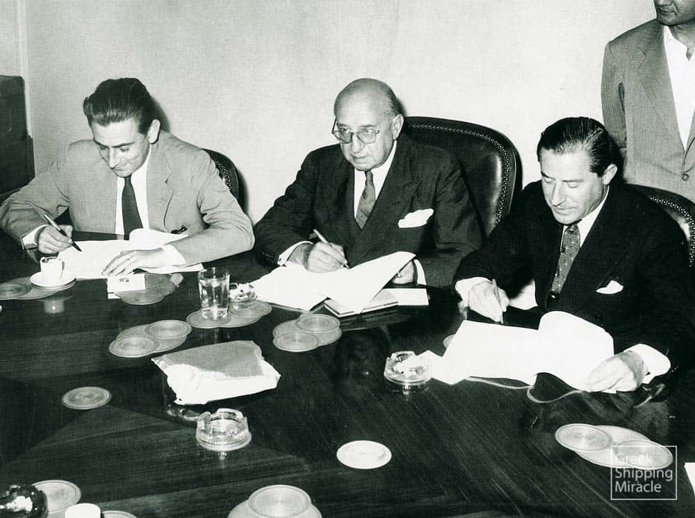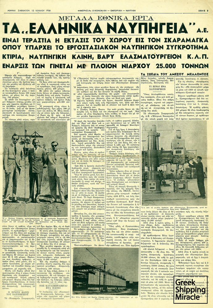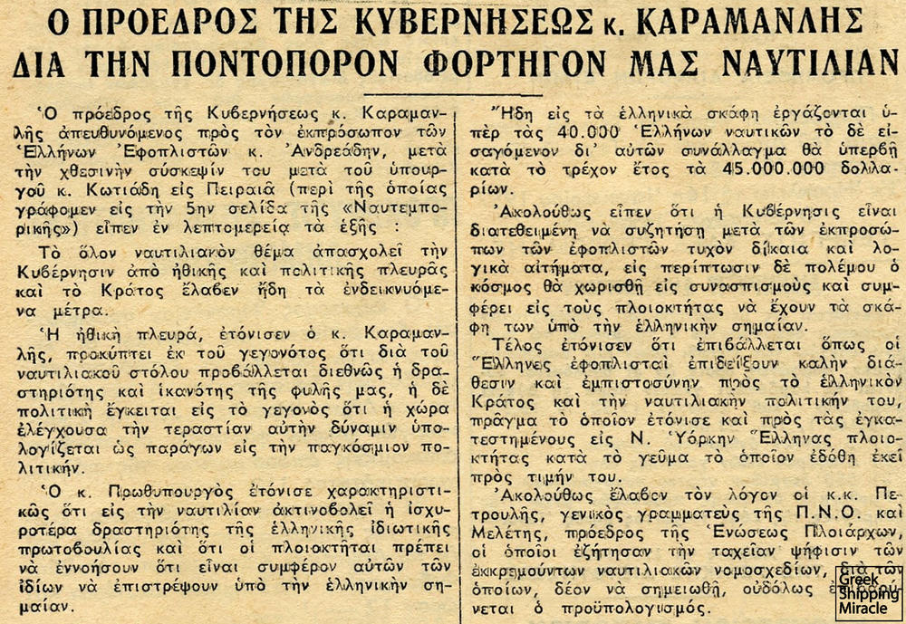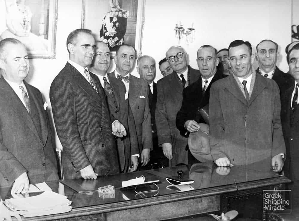 Λίγους μήνες αργότερα, τον Δεκέμβριο του 1956, ο Κωνσταντίνος Καραμανλής συνάντησε στη Νέα Υόρκη Έλληνες εφοπλιστές και τους προέτρεψε να υψώσουν την ελληνική σημαία στα πλοία τους. Την ίδια εποχή, η αναβάθμιση της υποδομής του μεγαλύτερου λιμανιού της χώρας, του Πειραιά, βρισκόταν μεταξύ των προτεραιοτήτων της κυβέρνησης.