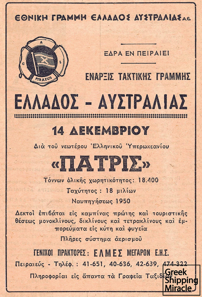 Ο Καραμανλής θεωρούσε ότι η παρουσία μιας μεγάλης εμπορικής ναυτιλίας με παγκόσμια παρουσία προσέδιδε κύρος στην Ελλάδα. Μάλιστα, φρόντιζε να αποδεικνύει έμπρακτα το ενδιαφέρον του για τη ναυτιλία. Στις 13 Δεκεμβρίου 1959, παρευρέθηκε στα εγκαίνια του υπερωκεανίου ΠΑΤΡΙΣ, με το οποίο εγκαινιάστηκε η γραμμή Ελλάδας-Αυστραλίας, παρά το γεγονός ότι όλος ο κυβερνητικός μηχανισμός ήταν απασχολημένος με τις διαδικασίες υποδοχής την επόμενη ημέρα του Ντουάιτ Αϊζενχάουερ, του πρώτου προέδρου των ΗΠΑ που επισκέφθηκε την Ελλάδα.
