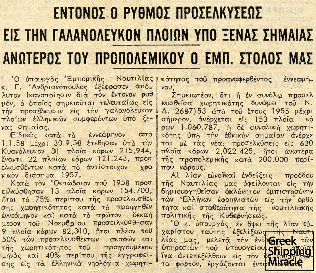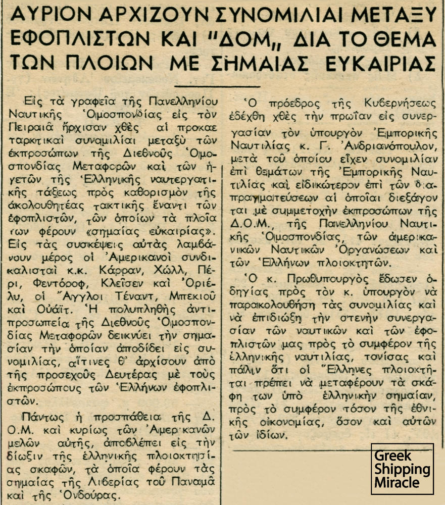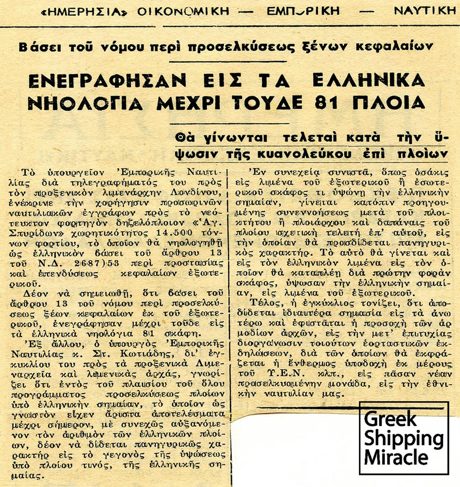 Το οικονομικό επιτελείο της κυβέρνησης με επικεφαλής τον υπουργό Συντονισμού Σπύρο Μαρκεζίνη, εκτίμησε το όφελος που θα προέκυπτε από το ενδεχόμενο εγγραφής στο εθνικό νηολόγιο εκατοντάδων ελληνόκτητων πλοίων, που είχαν αγοραστεί μεταπολεμικά και ταξίδευαν υπό ξένες σημαίες. Αυτή η προοπτική θα είχε επιπρόσθετο όφελος για τη χώρα, δεδομένου ότι το έργο ορισμένων εφοπλιστών είχε ήδη θετικό αντίκτυπο στην οικονομία αρκετών κρατών και, επομένως, θα μπορούσε να αξιοποιηθεί από την ελληνική διπλωματία.