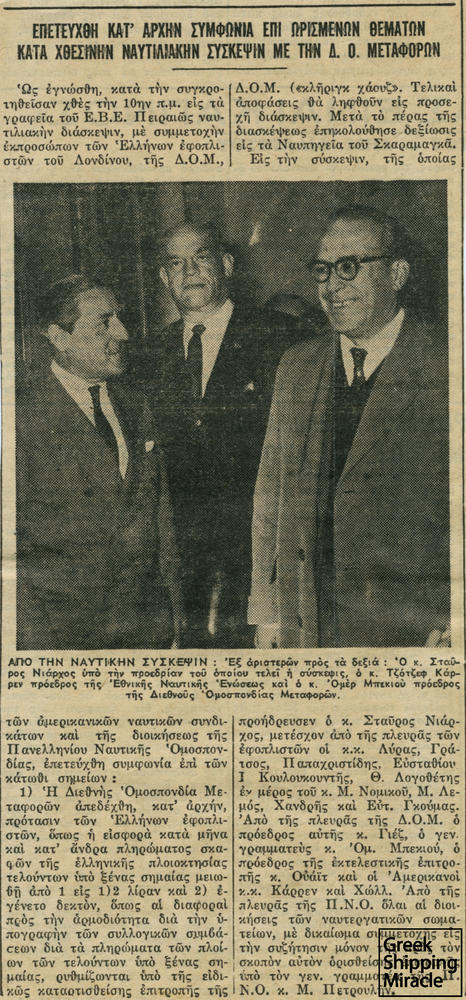 Το 1959, σημειώθηκε μερική βελτίωση στην παγκόσμια οικονομία δημιουργώντας πρόσκαιρα κλίμα αισιοδοξίας στη ναυτιλιακή βιομηχανία. Εν τω μεταξύ, αρκετοί Έλληνες εφοπλιστές ανταποκρίθηκαν στην έκκληση της κυβέρνησης αντικαθιστώντας μεγάλο αριθμό ξένων πληρωμάτων με Έλληνες ναυτικούς, προκειμένου να αντιμετωπιστεί η ανεργία. Παράλληλα, η εποικοδομητική συνεργασία μεταξύ των εφοπλιστών και της Πανελλήνιας Ναυτικής Ομοσπονδίας (ΠΝΟ) συνέβαλε στη θετική έκβαση των διαπραγματεύσεων με τους εκπροσώπους της Διεθνούς Ομοσπονδίας Μεταφορών.