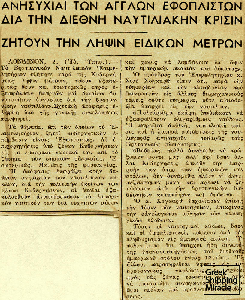 Ωστόσο, μετά από μία μακρόχρονη και ακμάζουσα περίοδο, το 1957 η ναυλαγορά είχε αρχίσει να σημειώνει ραγδαία πτώση. Πολλά νεότευκτα πλοία ξεκίνησαν με οικονομική ζημία τα παρθενικά ταξίδια τους, ενώ αρκετές παραγγελίες ακυρώθηκαν, με αποτέλεσμα την απώλεια σημαντικών κεφαλαίων από χαμένες προκαταβολές και αποζημιώσεις προς τα ναυπηγεία. Το δυσμενές κλίμα γύρω από τη ναυτιλιακή δραστηριότητα εντάθηκε με την επίθεση που εξαπέλυσε η Διεθνής Ομοσπονδία Μεταφορών (ΔΟΜ) ξεκινώντας αγώνα κατά των σημαιών ευκαιρίας, μεταξύ των οποίων ήταν και πολλά πλοία ελληνικών συμφερόντων. Η απειλή του αποκλεισμού κατά των εφοπλιστών που διαχειρίζονταν πλοία με σημαίες ευκαιρίας όπως του Παναμά, της Ονδούρας και της Λιβερίας, τους υποχρέωσαν να διαπραγματευτούν και να συνάψουν συμφωνίες με τους παράγοντες της ΔΟΜ. Οι συμφωνίες περιλάμβαναν την καταβολή τέλους, με το οποίο στην ουσία εξασφαλιζόταν η ασυλία των υπό σημαίες ευκαιρίας πλοίων τους. Την ίδια εποχή, οι διακρίσεις μεταξύ των πλοίων υπό ελληνική σημαία και των λοιπών ελληνόκτητων υπό ξένες σημαίες οδήγησαν σε υπέρμετρη αύξηση των ασφαλίστρων. Αυτό είχε ως αποτέλεσμα να καταστεί ακόμα πιο δυσχερής η εκμετάλλευση πολλών πλοίων εν μέσω βαθιάς κρίσης οδηγώντας εταιρείες στη χρεοκοπία, πλοία στον παροπλισμό και ναυτικούς στην ανεργία.