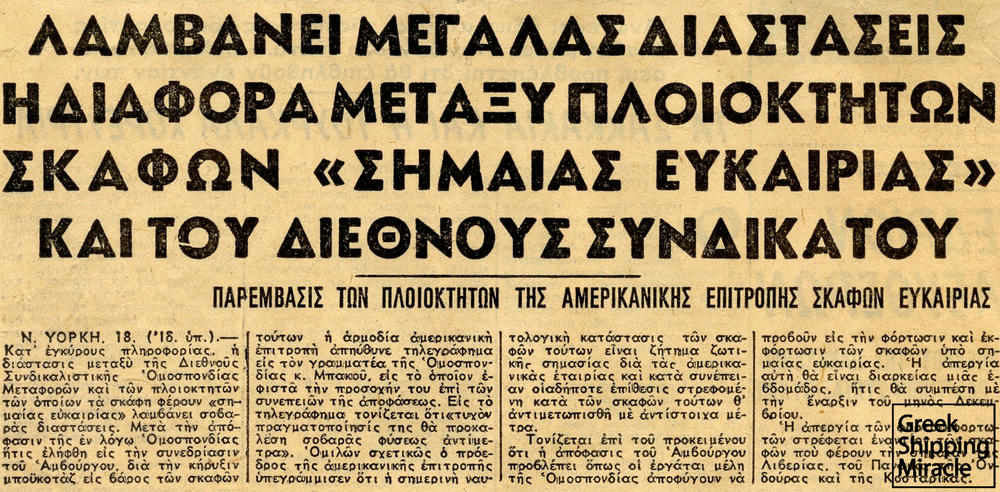Εν τω μεταξύ, η δημοσιότητα που λάμβανε η δραστηριότητα αρκετών Ελλήνων εφοπλιστών σε διεθνές επίπεδο προκάλεσε αντιδράσεις. Η αμερικανική κυβέρνηση το 1953 απηύθυνε κατηγορίες σε βάρος Ελλήνων εφοπλιστών, όπως ο Σταύρος Νιάρχος και ο Αριστοτέλης Ωνάσης, για παράνομη αγορά και διαχείριση πλοίων που ανήκαν στο αμερικανικό Δημόσιο, παρά το γεγονός ότι η αγορά των πλοίων είχε λάβει την έγκριση της αρμόδιας ναυτιλιακής επιτροπής των ΗΠΑ. Τελικά, η υπόθεση διευθετήθηκε με συμβιβασμό, ο οποίος προέβλεπε την επιστροφή ορισμένων από τα πλοία στην κυβέρνηση των ΗΠΑ και την καταβολή προστίμων.