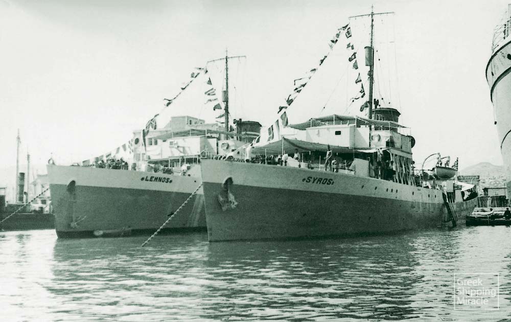- Το ΣΥΡΟΣ, κατασκευής 1941. ΙΣΤΟΡΙΚΟ Κατασκευάστηκε το 1941 ως κορβέττα στα βρετανικά ναυπηγεία Harland & Wolff Ltd., Belfast. Αρχικό όνομα BERGAMOT, βρετανική σημαία. Το 1946 αγοράστηκε από την ελληνική κυβέρνηση, μετονομάστηκε ΣΥΡΟΣ και ύψωσε ελληνική σημαία. Το 1950 αποκτήθηκε από την Ατμοπλοΐα Καβουνίδη Α.Ε., μετασκευάστηκε σε επιβατηγό και μετονομάστηκε ΔΕΛΦΙΝΙ. Το 1955 μετονομάστηκε ΑΙΚΑΤΕΡΙΝΗ. Το 1976 πουλήθηκε για διάλυση στο Πέραμα. (24/144)