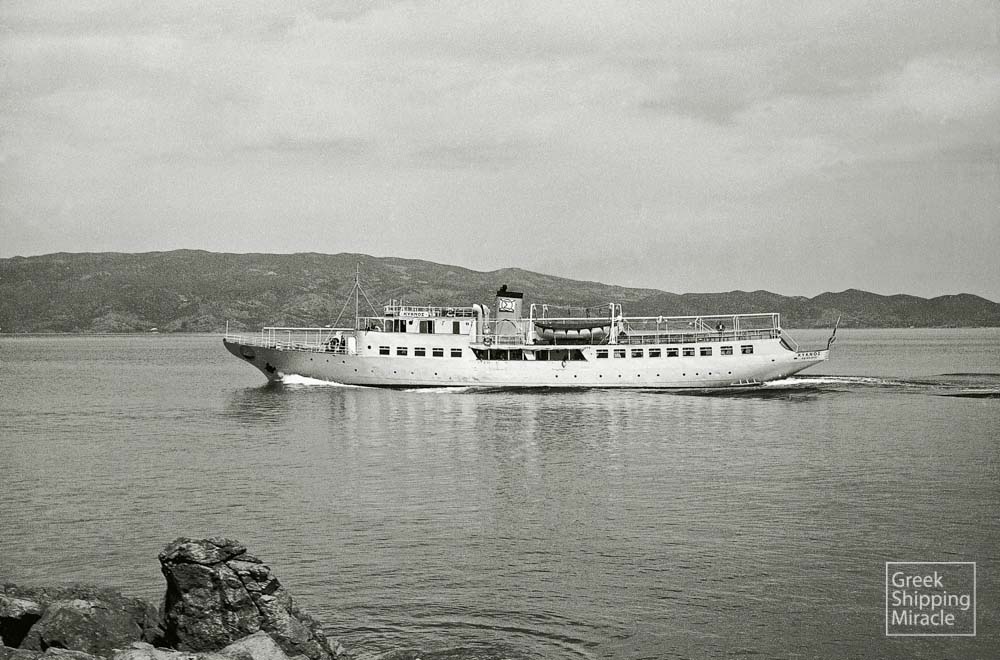 - To ΜΙΑΟΥΛΗΣ, κατασκευής 1952. ΙΣΤΟΡΙΚΟ Κατασκευάστηκε το 1952 στα ιταλικά ναυπηγεία Cantieri Riuniti dell' Adriatico, Monfalcone για την ελληνική κυβέρνηση στο πλαίσιο των ιταλικών πολεμικών επανορθώσεων. Αμέσως μετά την παράδοσή του αγοράστηκε από την Πέτρος Μ. Νομικός Α.Ε. Το 1973 πουλήθηκε στην Athenian Cruises S.A. To 1976 αποκτήθηκε από την Miaoulis Shippping Ltd. του ομίλου Στρίντζη και το 1977 από τους Αδελφούς Αγαπητού. Το 1988 πουλήθηκε για διάλυση στο Πακιστάν. (34/144)