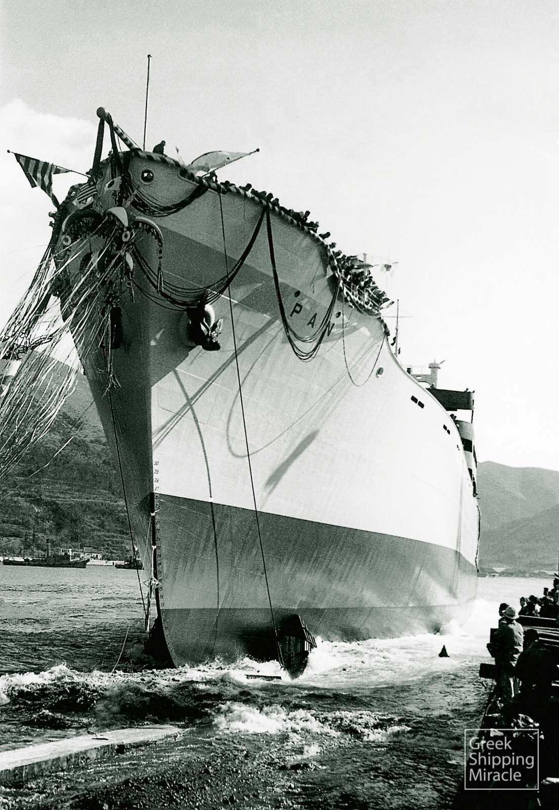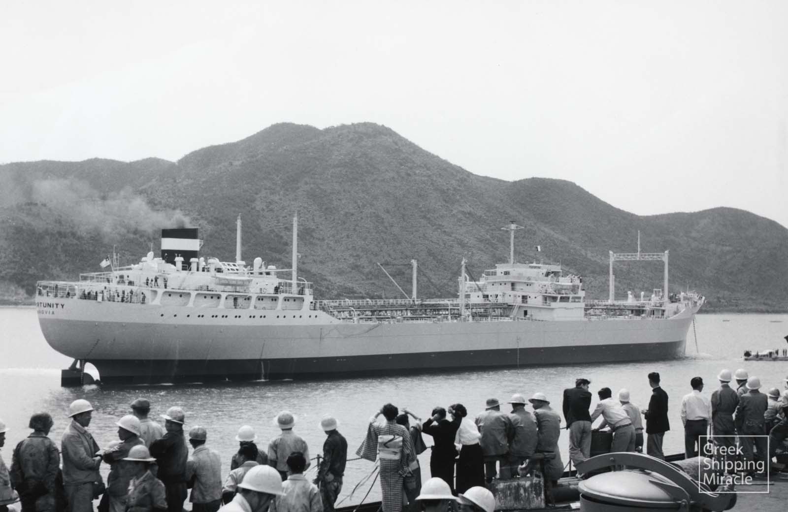 George Embiricos sold one more vessel in 1955, the Liberty-type RESOLUTE, before reaching another milestone in his career: the delivery of his first newly-built vessel in September 1955. It was the 32,500-dwt tanker HYDROUSSA, built at Japan’s Harima shipyards and placed under the Liberian flag. A few months later, in May 1956, he got delivery of a sister ship, the Liberian-flagged OPPORTUNITY, built at the same facility. A third ship, the 14,900-dwt cargo vessel PAN, was delivered by the same builders in August 1956. Lowering his fleet’s age profile even further, that year he also sold the Liberty CHALLENGER.