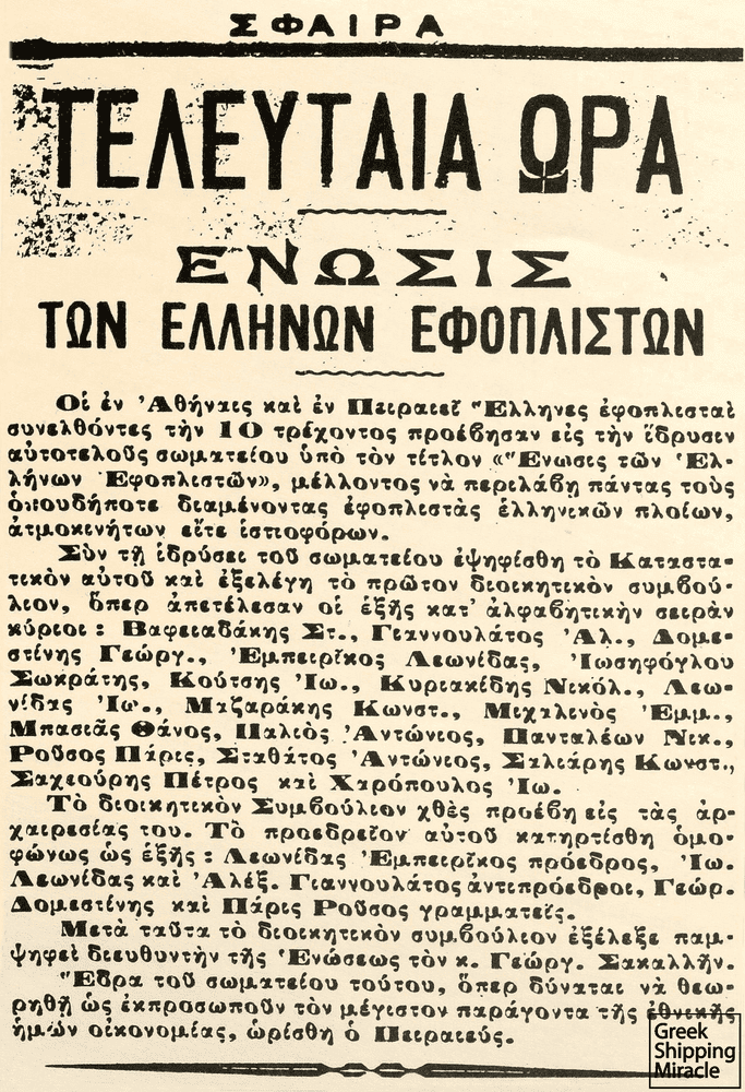 At the same time, the experience gained through various events during the Balkan Wars gave rise to strong concerns on the part of the shipowners. Several of them, led by Ghikas Coulouras, a master mariner from the island of Hydra, supported the need for the establishment of an association to safeguard the interests of the industry. However, this was not a simple issue at the time as on the one hand most shipowners were masters of their own vessels and, on the other, the majority of the few Greek shipping offices were based in the United Kingdom and specifically in London, Cardiff and Newcastle. As a result, nothing changed until the outbreak of the First World War, in September 1914, apart from the fact that approximately 100 steamers had been added to the Greek fleet.