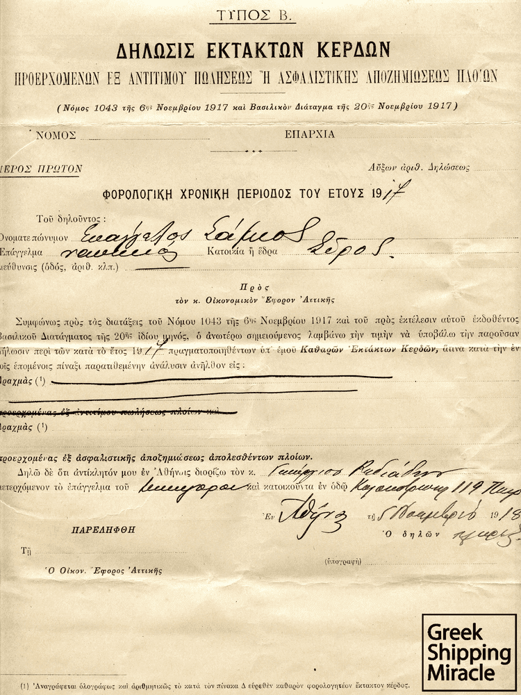 However, the Greek government had different ideas. From November 1917, a heavy retrospective tax was imposed on all shipping revenues dating back to 1915. This referred to all profits materialised through the sale, chartering as well as any insurance money paid to owners for war losses. Venizelos, who was re-elected Prime Minister, in his distress to see the Greek fleet rising to pre-war levels as quickly as possible, had a special decree incorporated in the same tax law. According to this, every owner replacing his steamship within a period of five years after the end of the War would be exempted from that particular tax. This decree, whose time limit was reduced from five years to two in 1919, led many owners to the hasty decision to invest most of their profits at the wrong time. This proved catastrophic for the majority of them, as well as for the industry, as it led to the rapid deterioration of its quality standards over the next few years.